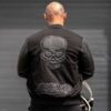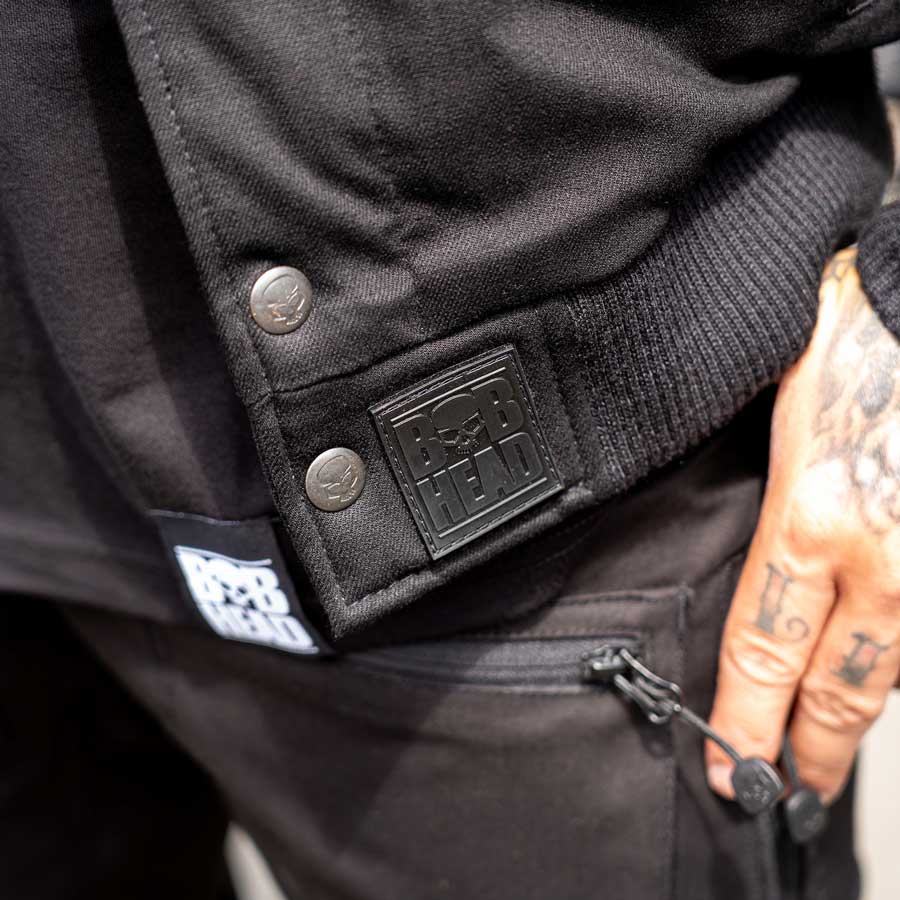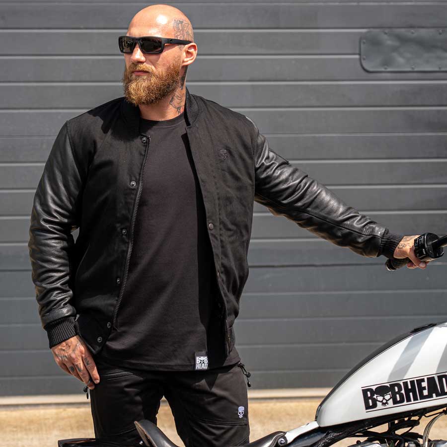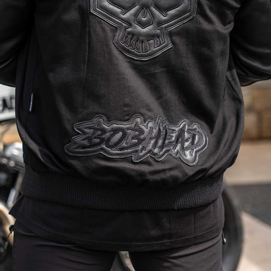 Make a statement with BOBHEAD’s Reaper College Jacket! Embroidered with BOBHEAD Skull and patterned branding featuring symbolic details, this men’s varsity-style jacket strikes a distinctive note. Mix of wool and leather. Easy