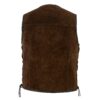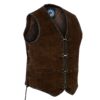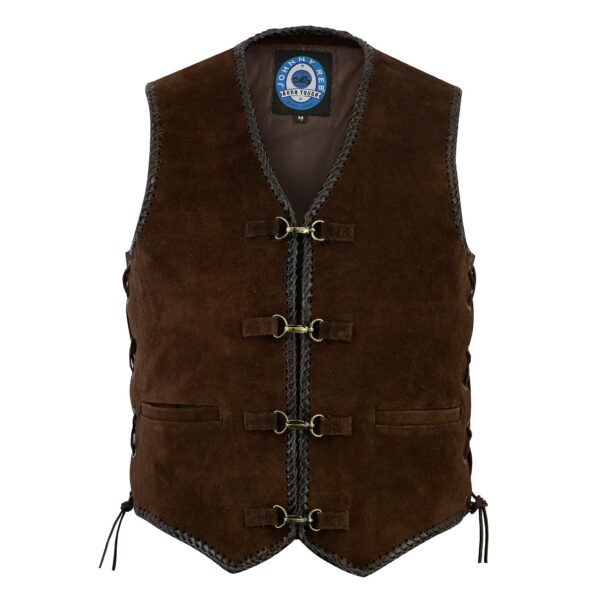 In a rich dark brown, the Men’s Gillies vest is made from soft smooth suede, featuring intricate hand-braided detail all around the edges.